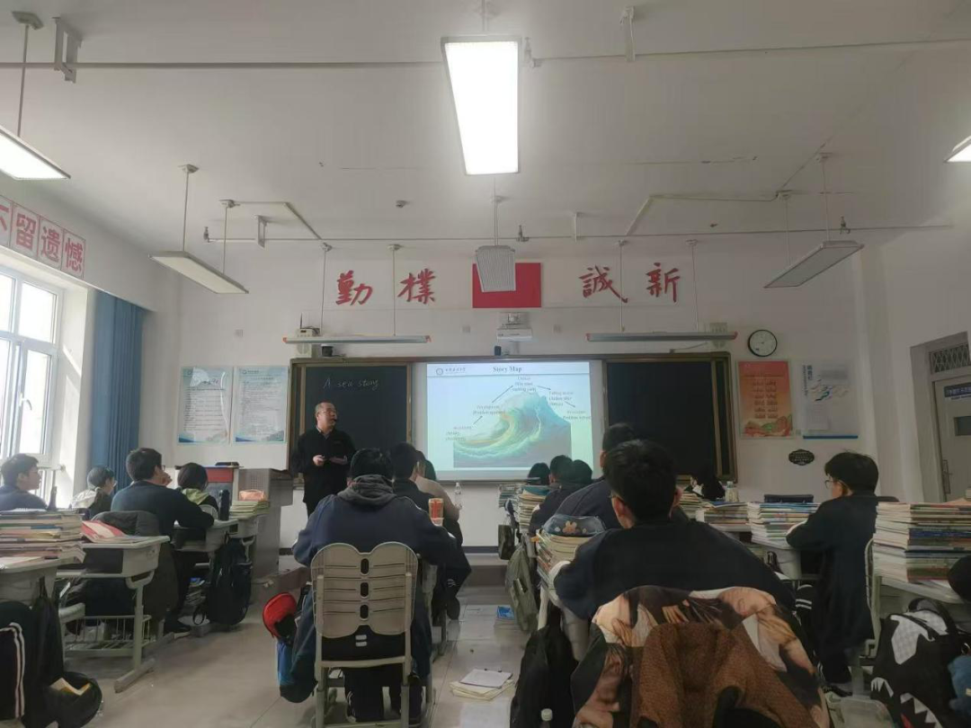孙润玺老师的授课内容是Unit 5 Humans and Nature Lesson 1 A Sea Story,孙老师通过丰富的图片让学生复习本节课所需的词汇,通过提问对于海洋的印象以及观看视频中莫斯肯漩涡的狂风暴雨,为学生们推测课文内容做了充分的铺垫。在整个教学过程中,孙老师用海浪的起伏生动地展现了Story Map的环节,引导学生迅速找到时间、地点、人物、事件这些故事中的必备要素,并对照Story Map分析故事发展和人物情感变化。整堂课较好的体现了教师阅读教学中的语篇意识以及对学生思维能力的培养。