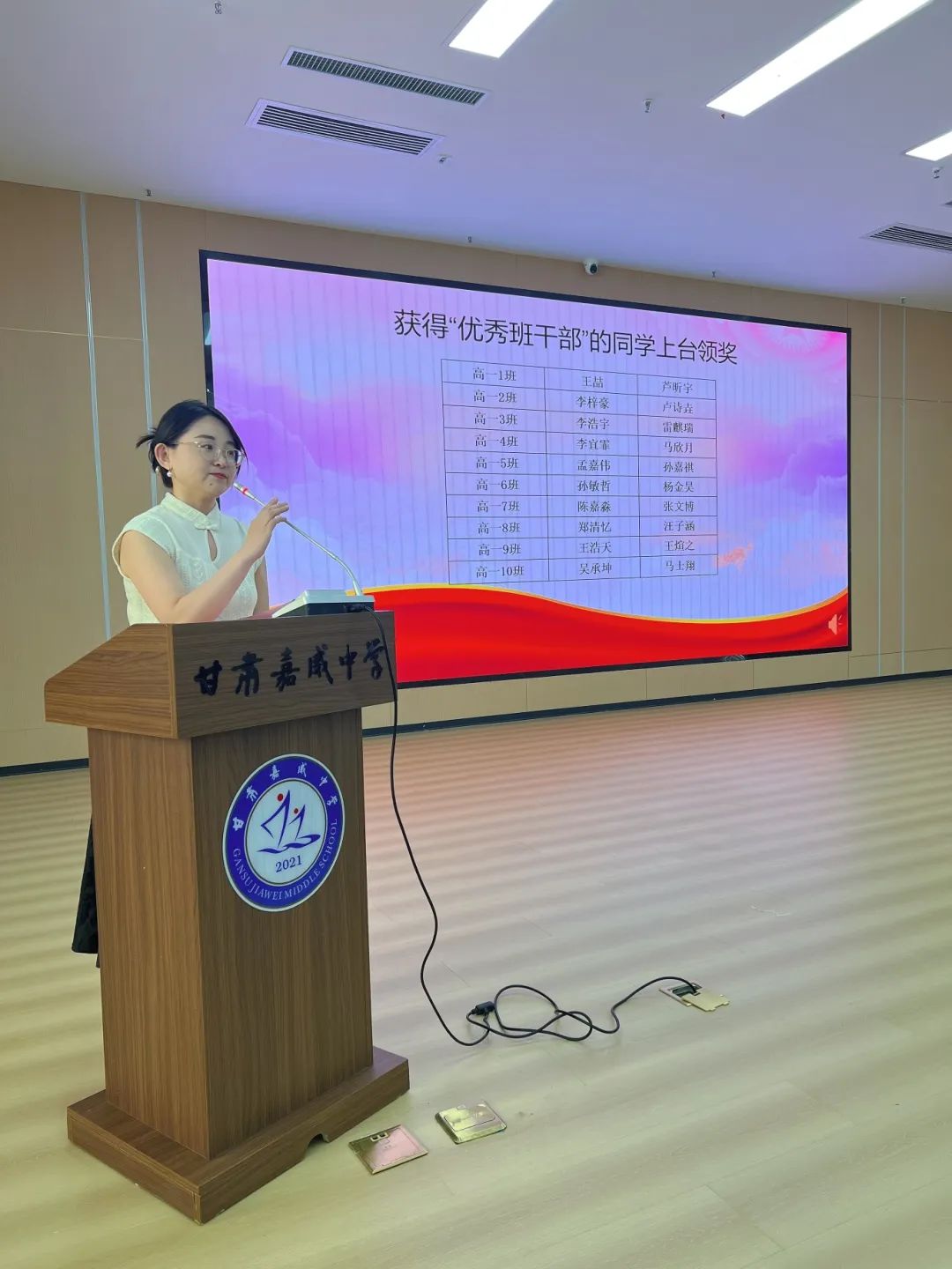 教务中心主任董娟老师宣读获奖名单。本次表彰设立学习标兵、学习之星、单科第一名、进步之星和优秀班干部共五类奖项。