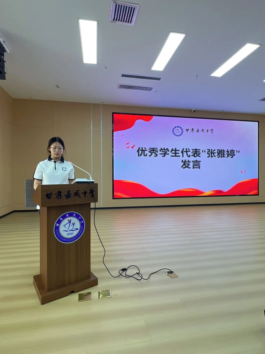 高一2班张雅婷同学作为优秀学生代表分享了自己的学习经验和心得体会。她认为学习没有捷径,唯有勤奋和坚持;在学习过程中,要制定合理的计划,注重课堂效率,及时总结反思;成绩只代表过去,新的征程已开启,大家是同学、同伴更是朋友、战友,向着目标全力冲刺!