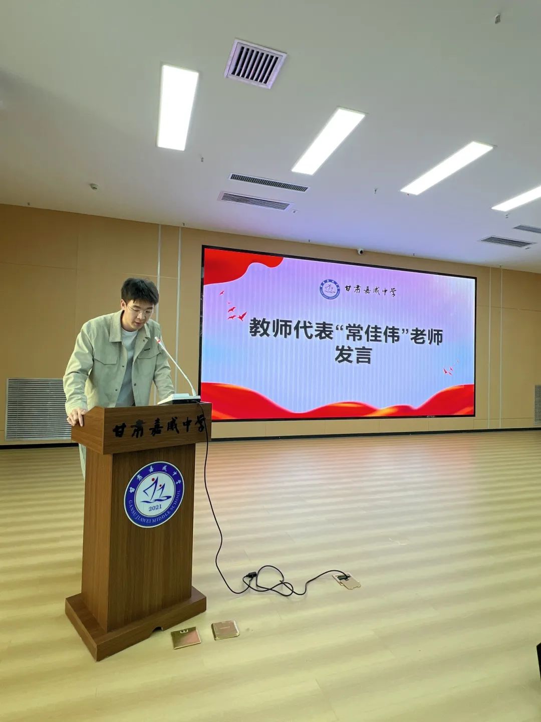 高一5班班主任常佳伟老师代表高一全体教师发言。常老师对获奖同学表示热烈祝贺,同时鼓励同学们:无论你是名列前茅的“领跑者”,还是正在蓄力追赶的“潜力股”,只要今天的你比昨天更进一步,就是值得骄傲的。并对同学们提出三点期待:保持清醒,做理性的思考者;脚踏实地,做行动的巨人;心怀热爱,做生命的探索者。希望大家以此次表彰为契机,总结经验,继续努力,在未来的学习中取得更大的进步。