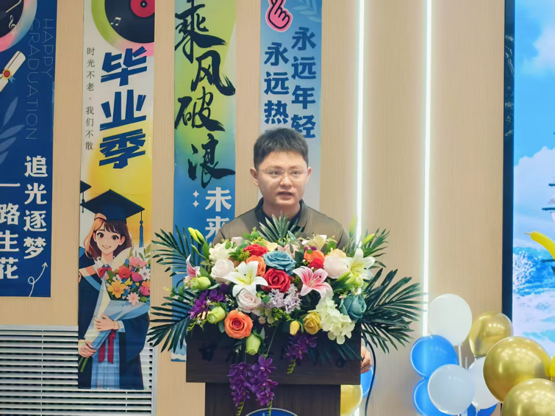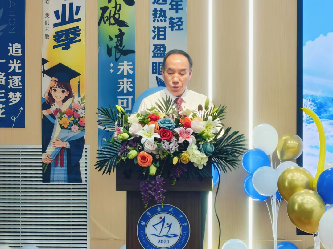 甘肃嘉威中学党总支书记、校长贾金元为毕业生们送上深情寄语并宣读毕业文件。他回顾了同学们三年的奋斗足迹,勉励大家铭记校训,胸怀家国,在未来的人生道路上勇毅前行。随后,甘肃嘉威集团总校副校长、法人代表丁杰致辞,宣读了对优秀毕业生的表彰决定,激励全体毕业生以优秀为榜样,追求卓越。毕业生们用热烈的掌声回应校领导的殷切期望,承诺定将铭记教诲,不负期望!