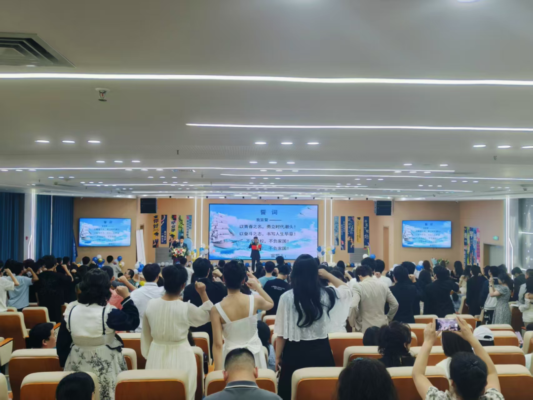 在庄严的时刻,全体毕业生肃然起立,在领誓人巨涵宇同学的带领下,高举右拳,以青春之名发出铿锵誓言:“以青春之名,勇立时代潮头;以奋斗之志,书写人生华章!不负母校,不负家国!”激昂的誓言响彻会场,展现了嘉威学子勇担使命、报效祖国的决心。