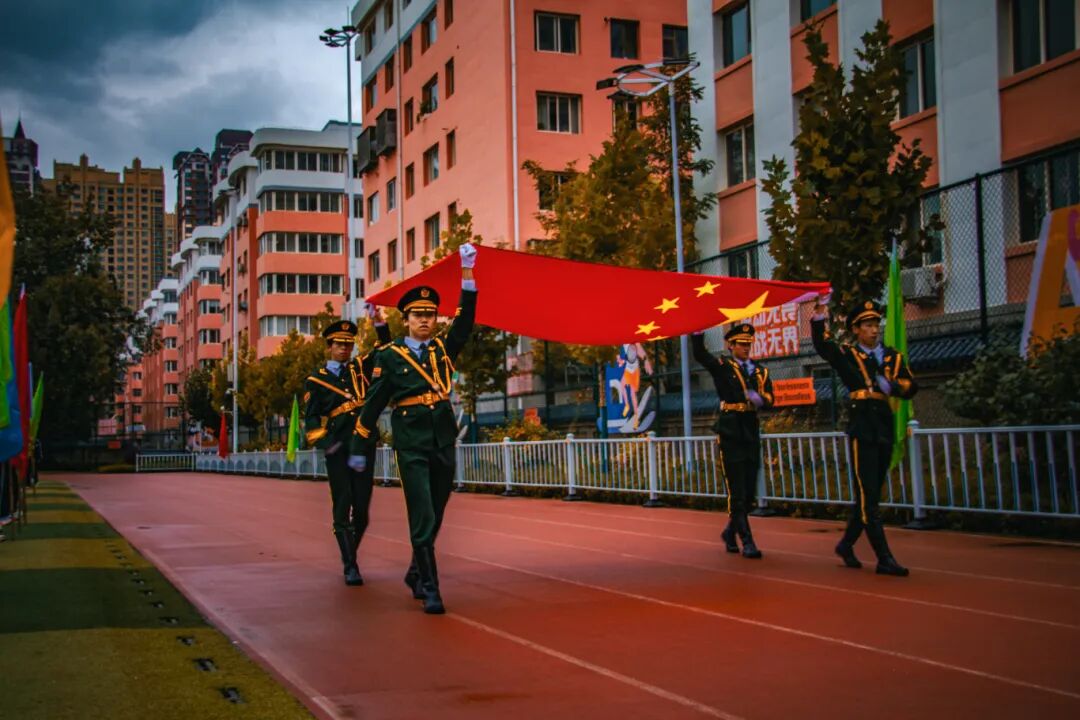 升国旗,奏唱国歌。在雄壮激昂的国歌声中,鲜艳的五星红旗冉冉升起,飘扬在学校上空。在国旗的见证下,同学们将在这里,挥洒汗水,见证荣光。