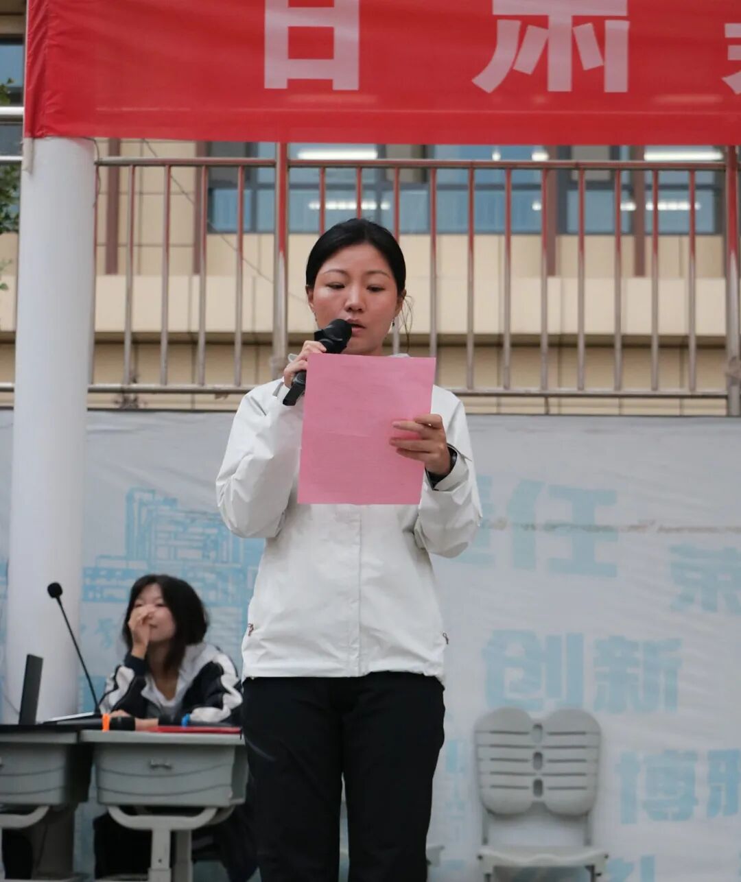 丁玲副校长致开幕词。丁校长表示,学校举办运动会,正是积极响应国家号召,践行“五育并举”教育理念的具体行动,旨在引导同学们在刻苦学习的同时,走向操场、增强体魄、健全人格,并激励同学们:体育的核心魅力在于永不言败的拼搏精神,人生的要旨并不在于凯旋,而在于奋斗。